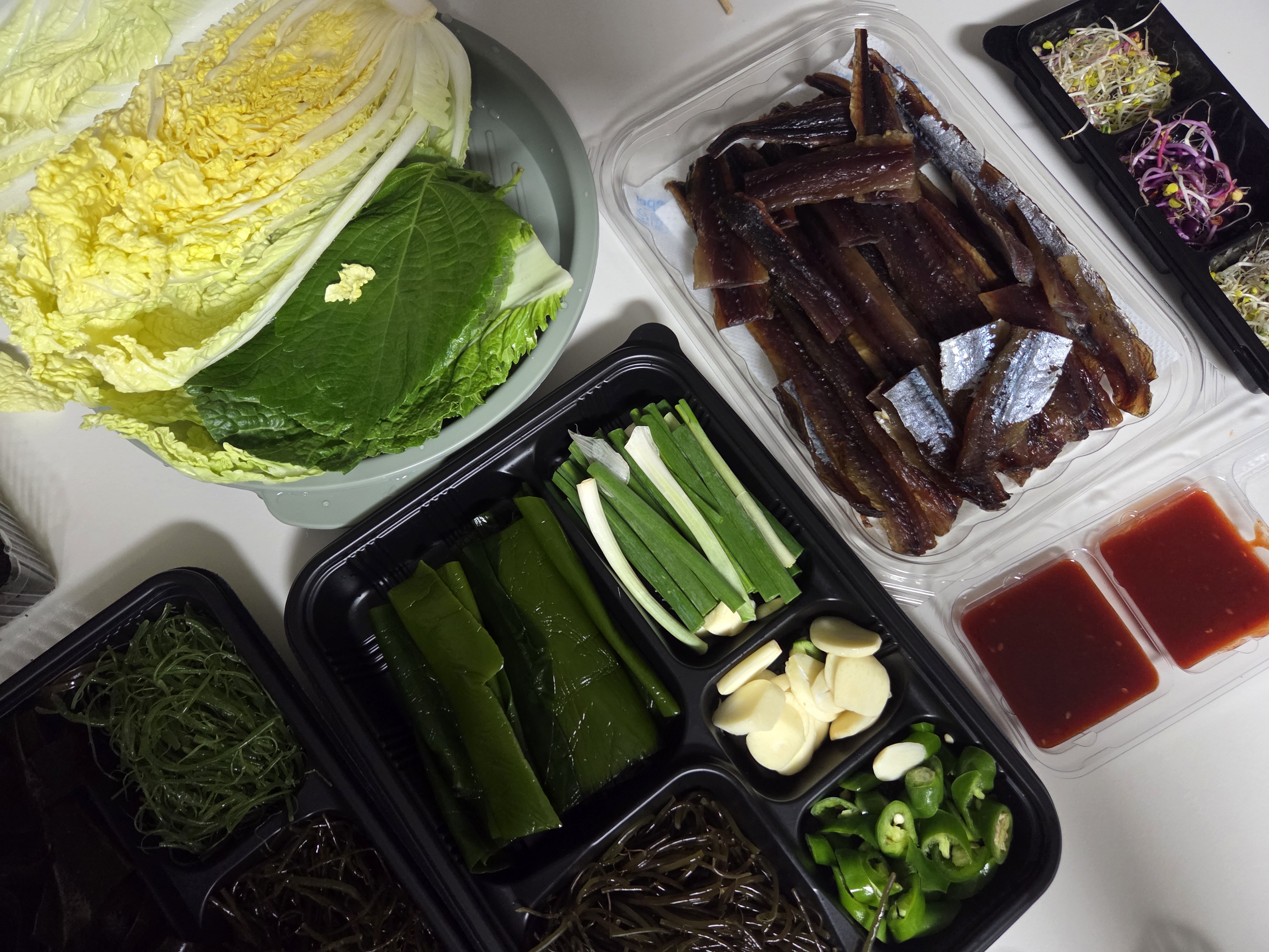 각종 쌈 야채는 물론 다양한 해초류를 푸짐하게 담아주시니 추가적으로 준비할 것이 없다 ^^ 그냥 주시는 재료들로 먹으면 풍요롭고 충분하다! 김과 초장도 넉넉히 챙겨주신다.