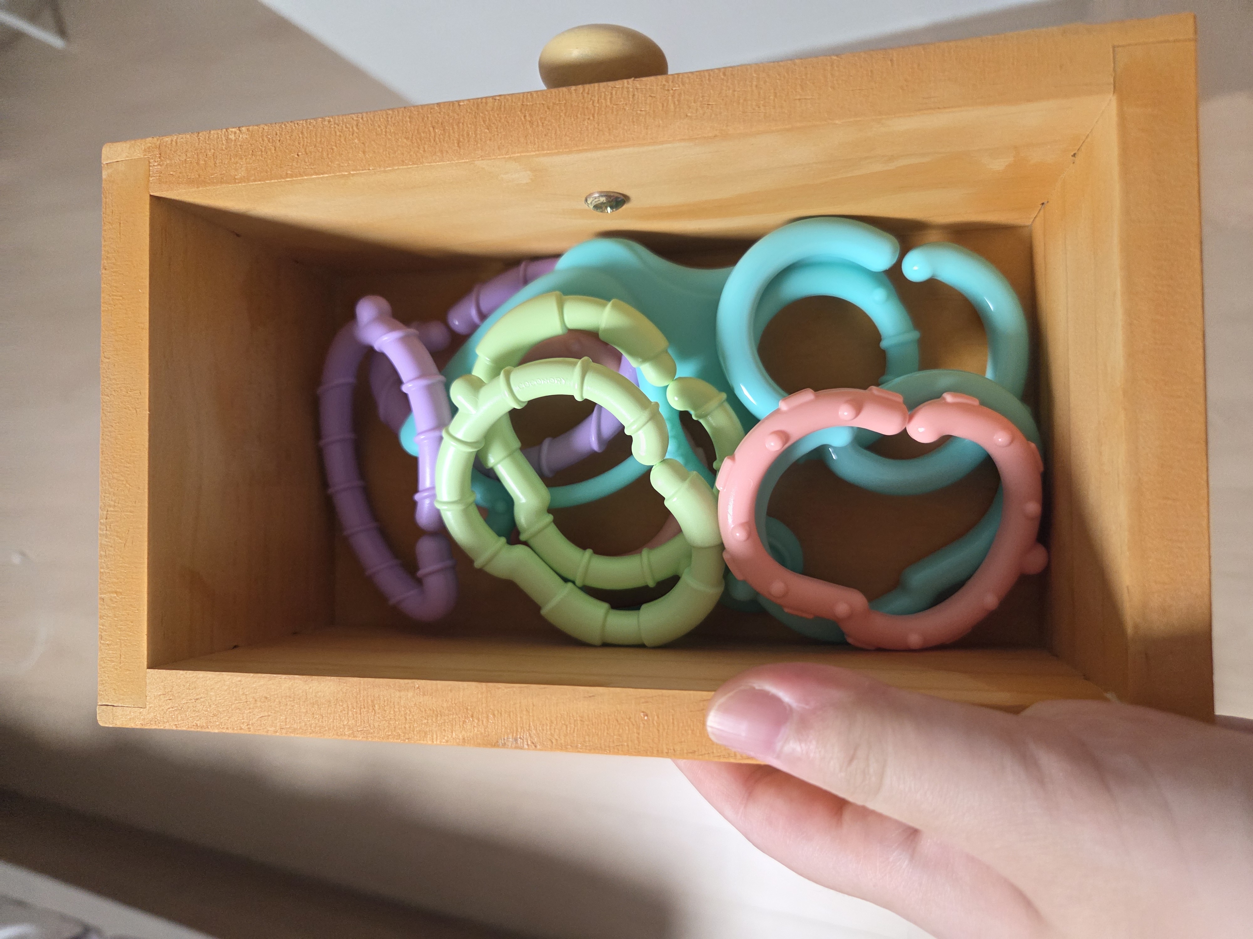 고리마다 돌기 모양이 달라서 다양한 촉감놀이도 가능하고. 소재도 좋아서 믿고 사용 가능! 무엇보다 식세기 세척이나 소독기 소독이 바능하대서 좋았다. :)